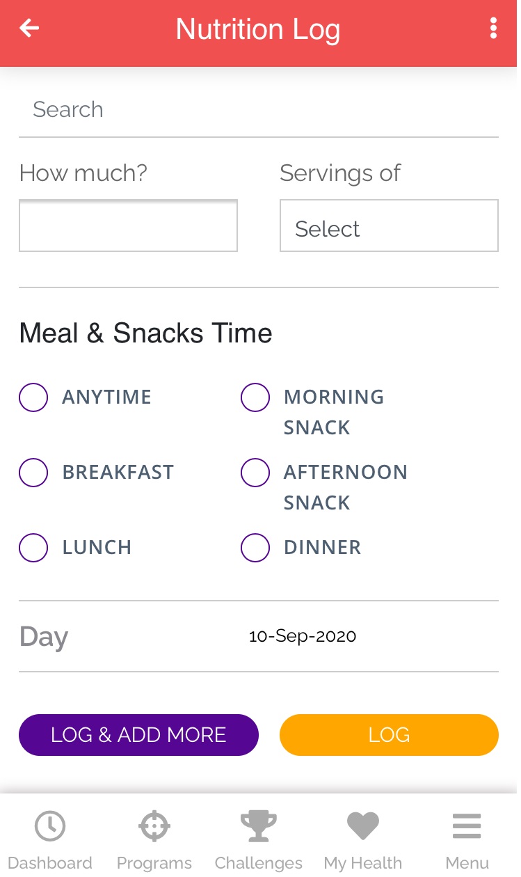 6. Tap on ‘Log’ to save all the details. Tap on ‘Log & Add More’ to add the next nutrition log details.